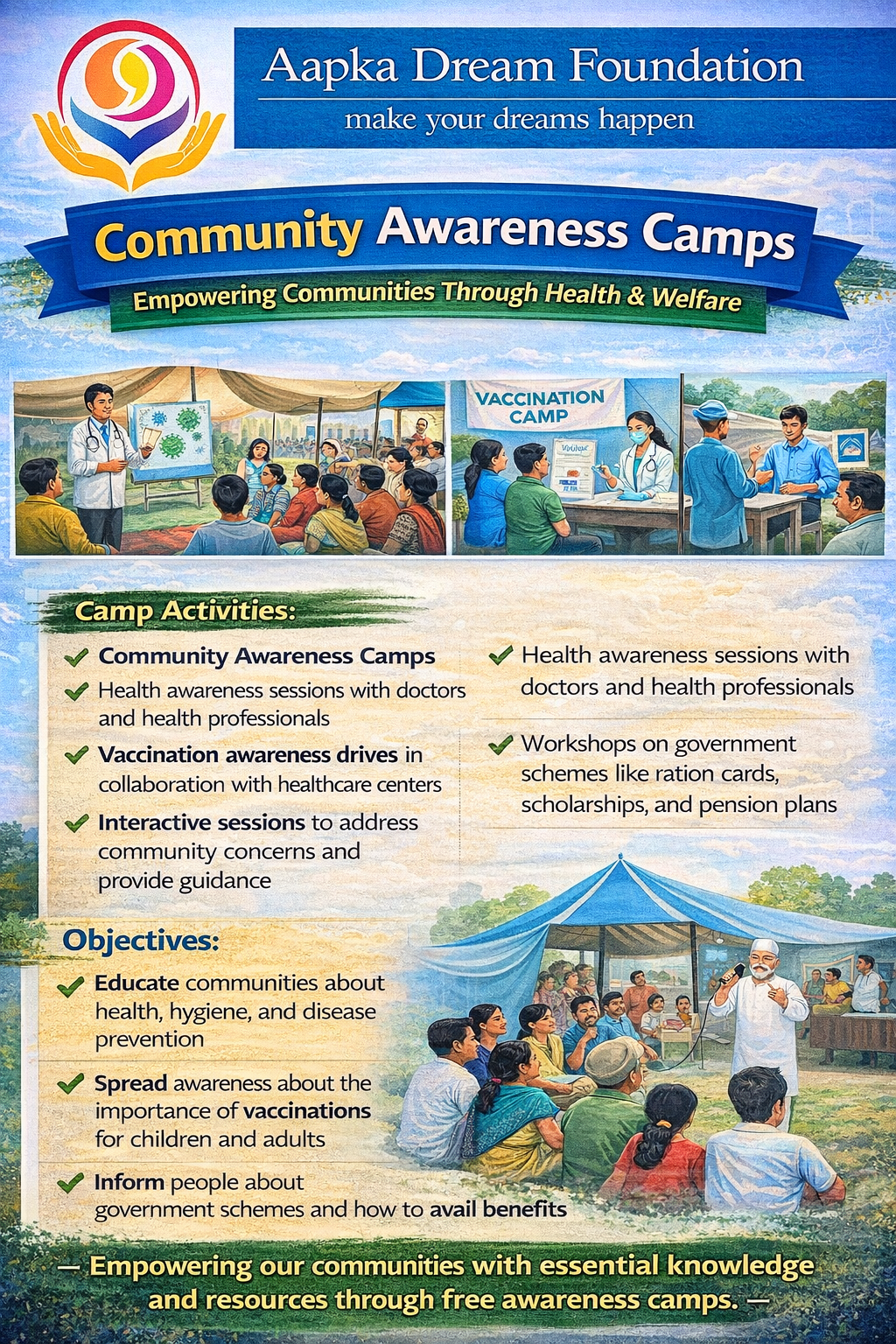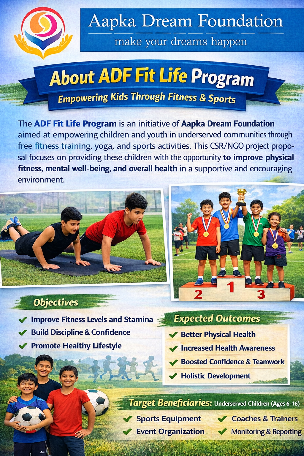 The ADF Fit Life Program is a flagship initiative of Aapka Dream Foundation, designed to promote a healthy, active, and disciplined lifestyle among children from underserved communities. The program focuses on providing free of cost weekly fitness training, including physical exercises, yoga, and sports activities, ensuring that every child gets an equal opportunity to stay fit and active. A unique feature of this program is its structured monthly assessment model. Every second Saturday of the month, a Fitness & Sports Competition is organized where children actively participate and showcase the progress they have made through weekly training sessions. These competitions help in evaluating improvements in fitness levels, stamina, confidence, discipline, and teamwork. Through continuous engagement, the program encourages children to become more health-conscious, adopt positive daily habits, and understand the importance of physical and mental well-being. It also creates a safe and motivating environment where children not only learn but grow holistically. The program primarily targets children aged 6 to 16 years from communities where access to fitness facilities and structured sports activities is limited. By bridging this gap, ADF aims to build a generation that is physically strong, mentally resilient, and socially confident. With the support of donors and partners, the ADF Fit Life Program continues to expand its reach and impact. Contributions help in organizing training sessions, conducting monthly competitions, providing sports equipment, and ensuring smooth program implementation.